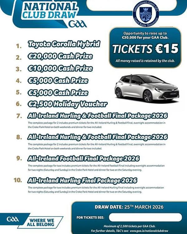 The GAA National Club Draw is back — and every €15 ticket goes directly to supporting our club’s teams, facilities, and future.