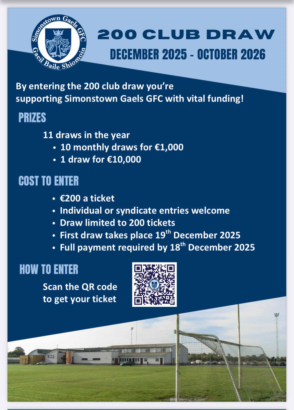 200 Club Draw limited to 200 tickets with monthly draw for 11 months. Individual or Syndicate entries welcome. FIRST DRAW 19th DECEMBER 2025!